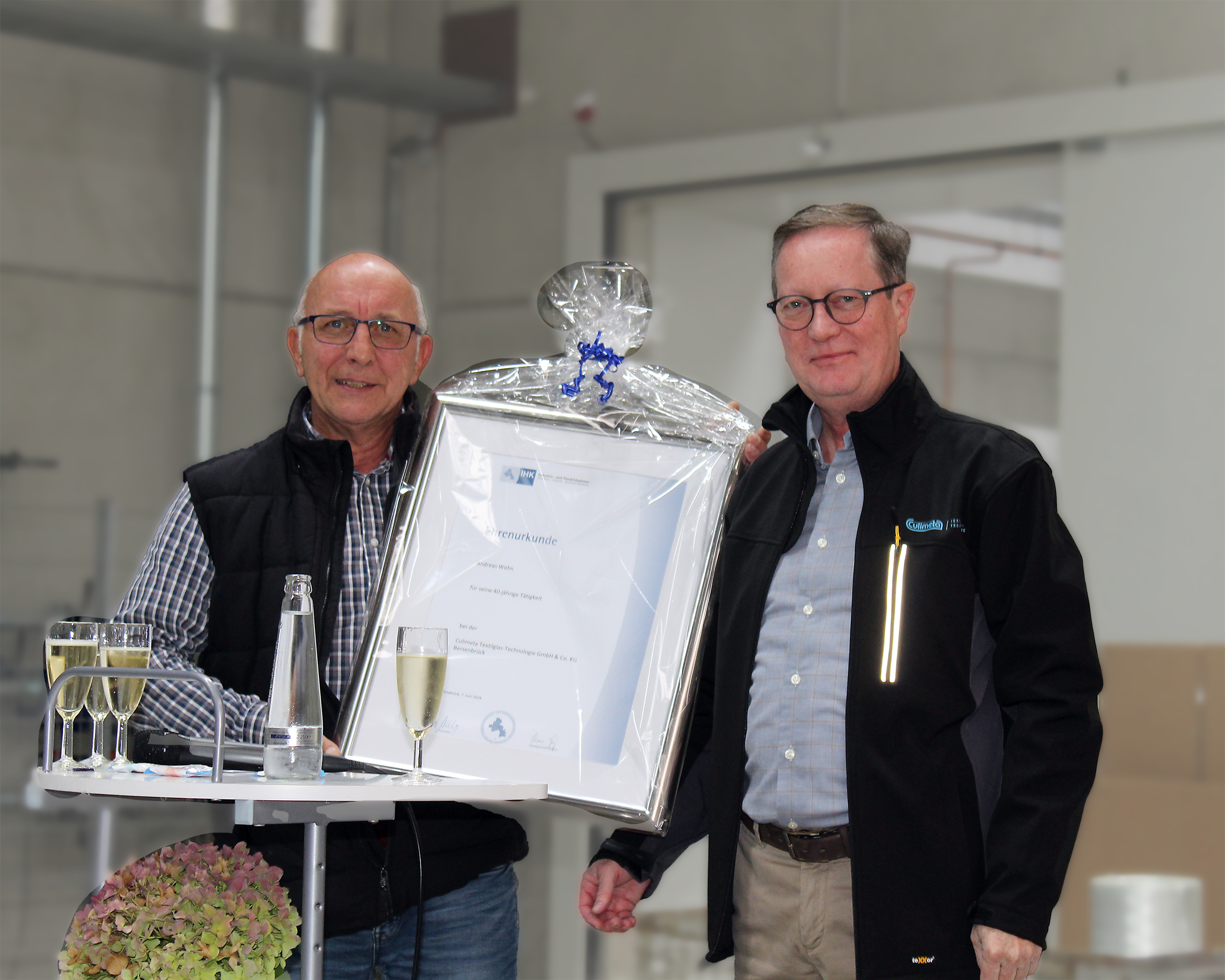 "Andreas Wohn – wie Wohnzimmer nur ohne Zimmer!" Diesen Satz hört man bereits seit vier Jahrzehnten in den Hallen von Culimeta. Im Alter von 22 Jahren startete Andreas als Mitarbeiter in Versand und Lager. Aus dieser Position heraus arbeitete er sich kontinuierlich hoch, zunächst zum Versandleiter und später zum Produktionsleiter. In all diesen Jahren hat er nicht nur unzählige Dichtungen entwickelt und produziert, sondern mit einer Engelsgeduld zudem die vielen Auszubildenden und Praktikanten betreut. Auch die zahlreichen unternehmerischen Entscheidungen, wie der Umzug der Flechterei nach Mölln und die spätere Rückkehr nach Bersenbrück, hat er stets mitgetragen - "auch wenn es nicht immer leicht mit den Holländern war", so Andreas schmunzelnd. Für diesen unermüdlichen Einsatz und die erfolgreiche Zusammenarbeit würdigte am 17. September 2024 die Culimeta Geschäftsleitung Andreas Wohn während der Betriebsversammlung im Werk 2. Natürlich durfte auch die IHK-Urkunde für 40 Jahre Betriebszugehörigkeit nicht fehlen, die nach Worten von Andreas "von Jubiläum zu Jubiläum größer wird." Andreas wird im kommenden Mai in den wohlverdienten Ruhestand gehen und die 41 Jahre Betriebszugehörigkeit leider nicht mehr vollmachen. Die Geschäftsführung und das gesamte Team bedankt sich herzlich für die gemeinsamen erfolgreichen Jahre.